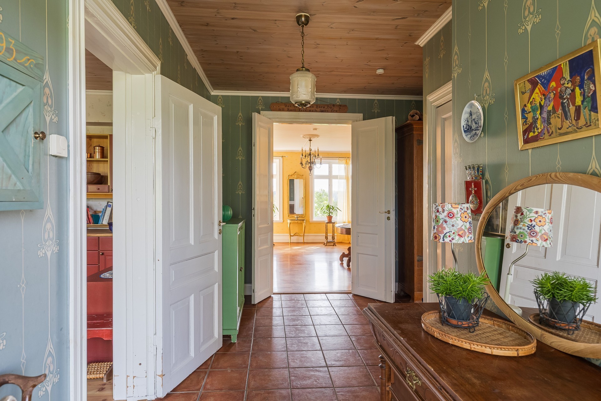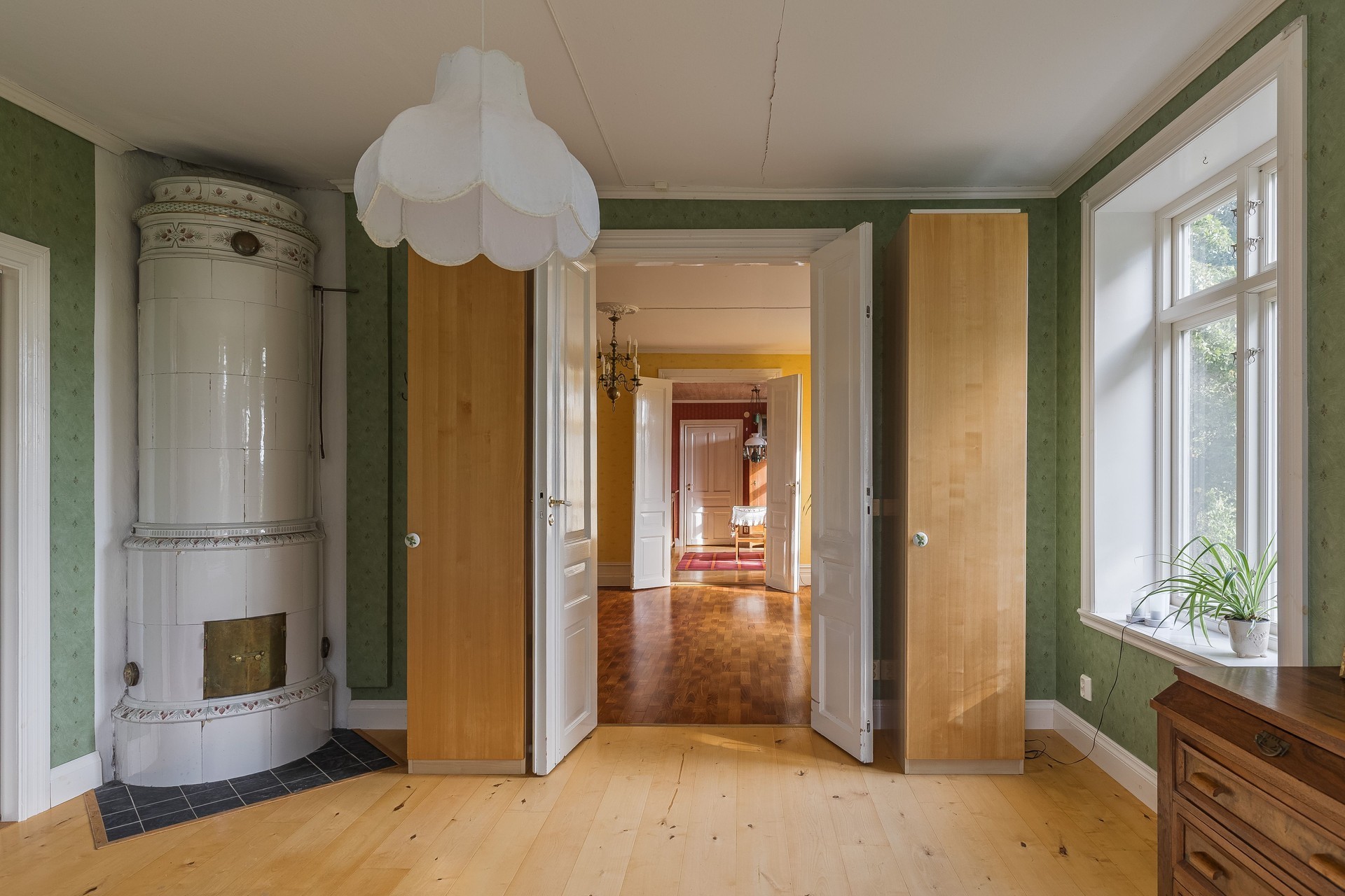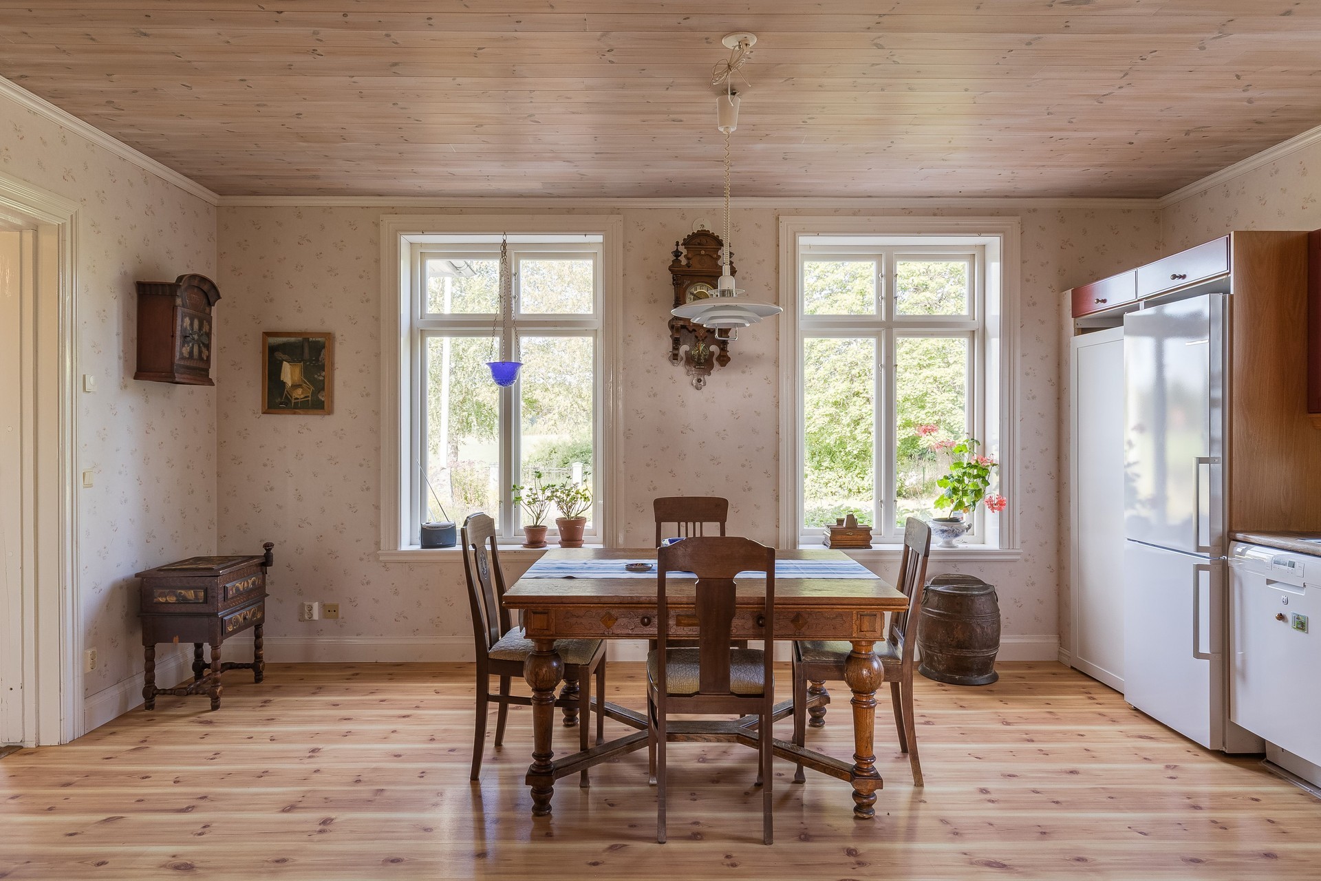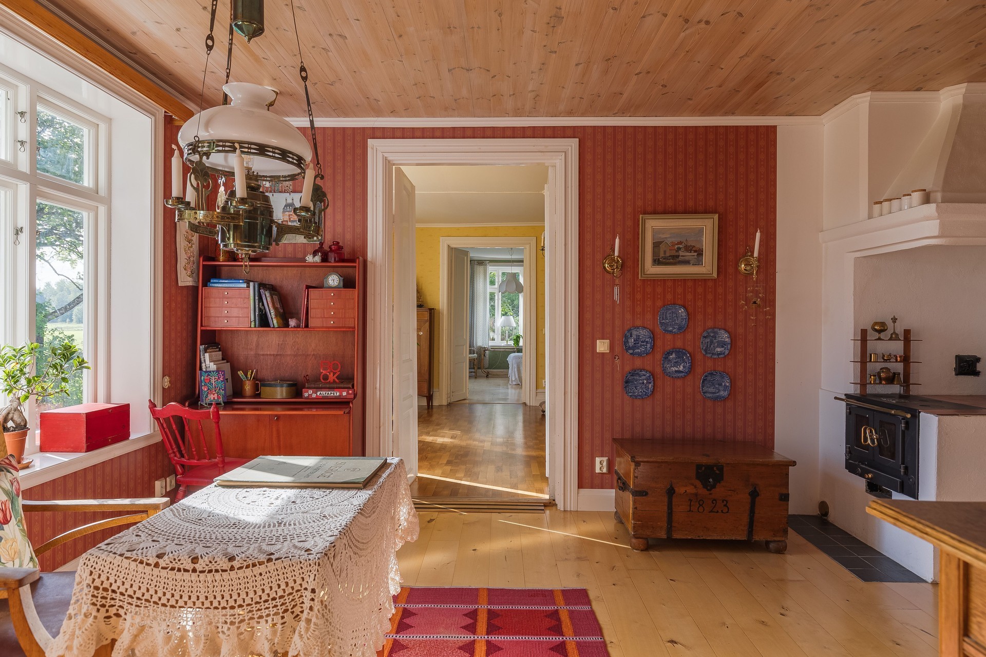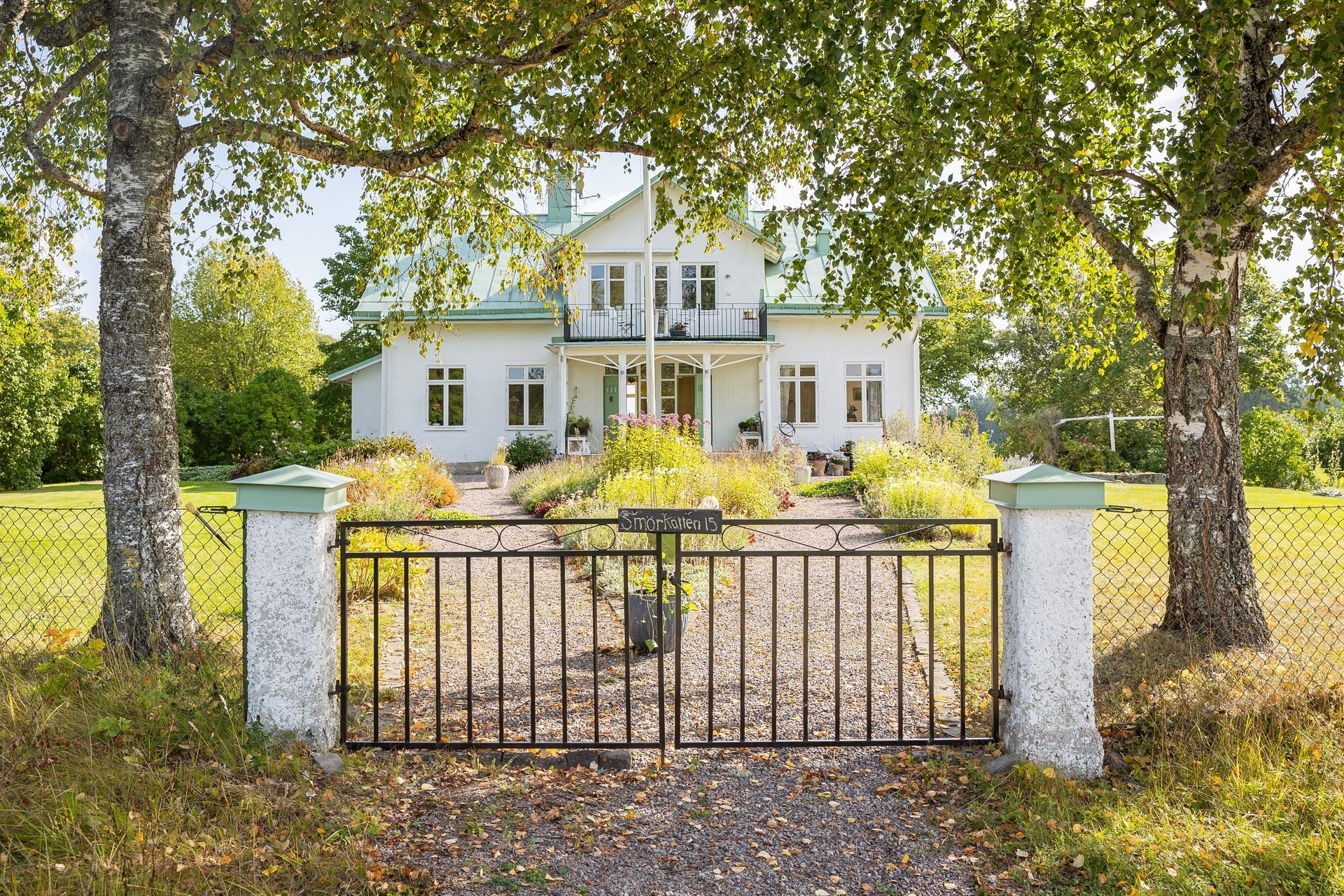Bostaden är inredd som två separata lägenheter, en på varje våningsplan. Lägenheterna är helt separerade och båda är fullt inredda. Lägenhet entréplan: Nedre lägenheten är cirka 130 m² boarea fördelat på fyra rum och kök. Köket är fullt utrustat och har gott om plats för matbord. Vardagsrummet har mycket stora fönsterytor som ger en fin utsikt över gårdens marker. På bottenvåningen finns ytterligare tre rum varav två är lämpliga som sovrum och ett som kontor/matrum. Flera av rummen har fina kakelugnar bevarade (f.n. ej godkända att elda i). Ett av rummen har en vedspis som går bra att nyttja. Lägenheten på nedre botten har två badrum som båda har WC samt dusch/duschkabin. Dessutom en separat groventré samt tvättstuga. Samtliga rum på bottenvåningen är ljusa och rymliga, takhöjden är väl tilltagen och golvvärmen gör inomhusklimatet behagligt. Lägenhet övre plan: Övre lägenheten är cirka 100 m² boarea fördelat på två rum och kök. Lägenheten på övre plan har en stor rymd, gott om fönsterytor samt golvvärme för ett behagligt inomhusklimat. Entrén är på bottenvåningen. Planlösningen på övre plan är relativt öppen med stort vardagsrum/allrum med fönster åt två håll, öppet upp till nock samt utgång till balkongen. Balkongen har en fin utsikt över trädgården och bostadens entré. Köket är något mindre än det på bottenvåningen, men fortfarande fullt utrustat och gott om plats för matbord. Köket är renoverat 2021. Invid matplatsen finns även ett mindre rum som går att nyttja som stort förråd eller litet kontor. Övre lägenheten har ett sovrum med stor klädkammare. Detta ligger i omedelbar anslutning till badrum och tvättstuga som båda är rymliga och fint inredda. Badrummet renoverades år 2012. Under ungefär halva huset finns en källare som man når utifrån. Källaren inrymmer generösa förrådsutrymmen samt "pannrum" med plats för värmepump, vattenpump etc. Då marken bakom huset är lägre än på framsidan är källarfönstren relativt stora vilket gör att källaren är ljus. Dessutom är takhöjden i källaren god. Såväl tidigare som nuvarande ägare har lagt stort fokus på att sköta och utveckla trädgården på gården. Det finns massor av rabatter med mycket fina blommor som är väl genomtänkta så man får en vacker trädgård som blommar under stor del av året. Det finns dessutom en fin äppellund som innehåller många fina äppelträd av flera sorter. Det finns även ett fint iordninggjort växthus som mer är att likna vid ett mindre orangeri. För den som vill se mer bilder från gårdens trädgård och hur vackert den förändras under året har gården en egen Instagramsida; "smorkattenhagagard".